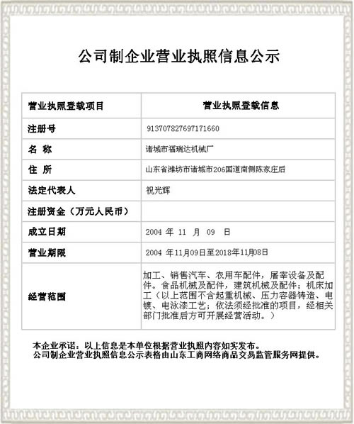 • 公司簡介      諸城市福瑞達機械有限公司 是一家專業開發設計,生產制造畜禽屠宰設備的私營企業.位于山東省諸城市龍都工業園,緊靠206國道,膠新鐵路,交通十分便利.       我廠現有中,高級技術人員數名,有多年的設計與制造畜禽宰殺機械的理論和經驗.可根據客戶的要求進行前期的工藝設計及流程布局,中期的設備安裝與調試,以及后期的售... [詳細內容]